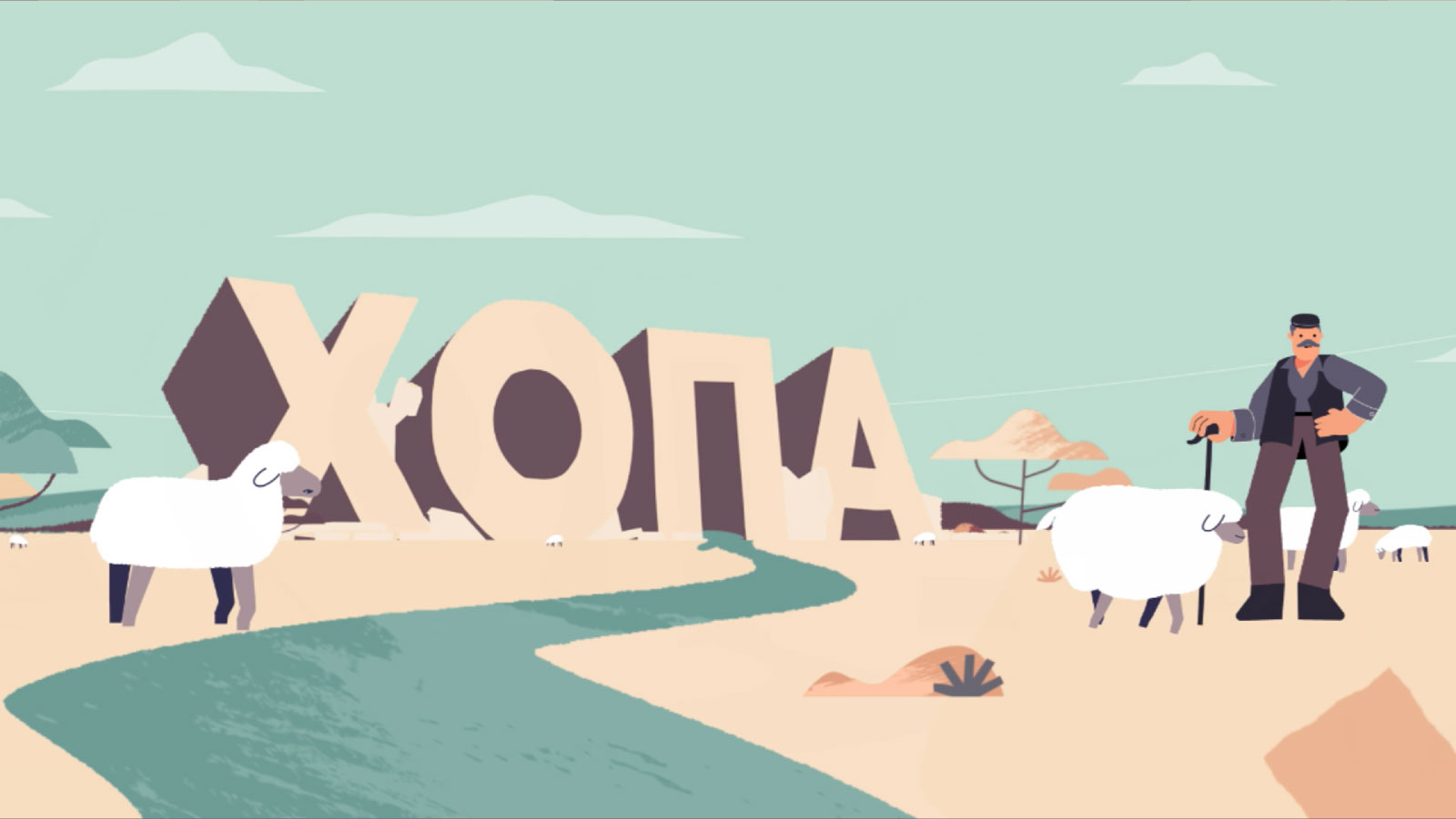 With this cheesy stereotype in mind we’ve created the exuberant character of a shepherd. We capture the moment where the he sweet-talks a sheep on the riverbank and encourages it to jump to the other side. How does the shepherd achieve this? He yells HOPA! After which the sheep, in a single, elegant movement jumps across the flowing river. Having registered the meaning and connotation of the word ΧΟΠA/FAST, Χέρια/Hands, Ομιλία/Speech, Πρόσωπο/Face, Ασθενοφόρο/Ambulance the protagonist illustrates the above stroke symptoms.